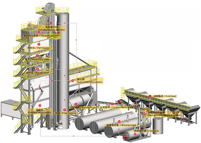冷骨料給料機,拌合樓、成品倉、除塵器、瀝青罐均為整體模塊化,便于運輸安裝。